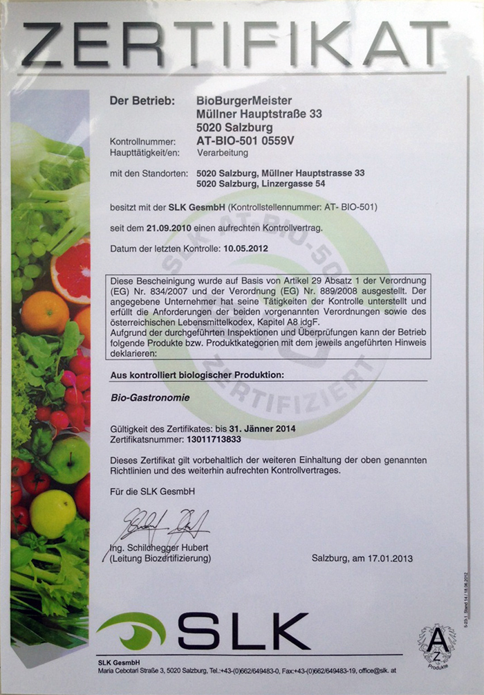 Alle im BioBurgerMeister verwendeten Produkte und Zutaten, sowie alle selbst erzeugten Saucen, Gemüsepatty, Salat, Chips (natürlich auch das Öl) sind ausnahmslos von hervorragender Bio-Qualität – und das nachweislich. Wir sind 100% Bio!